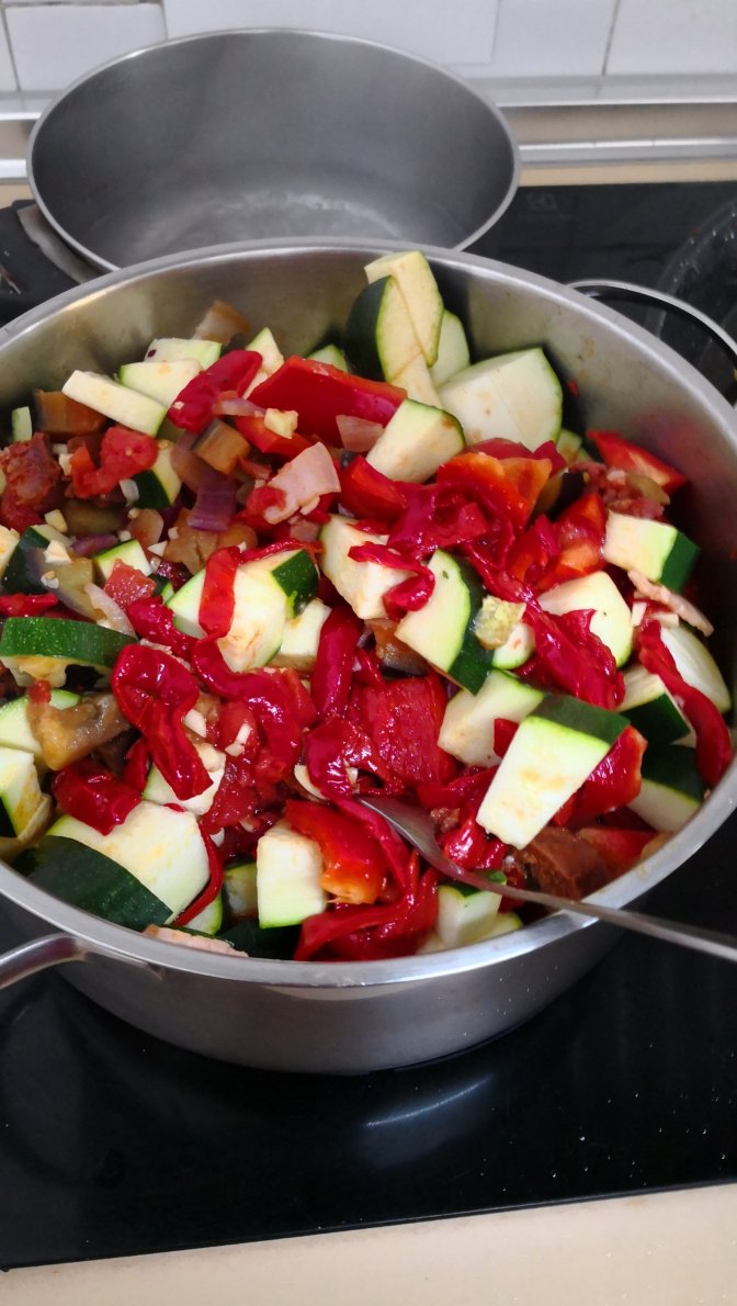 Kathrynne Bindi and I were cooking for the Italian Mob tonight. Ratatouille, wine, bread, cheese and all the makings for 10 people €33, think we should move to Spain.