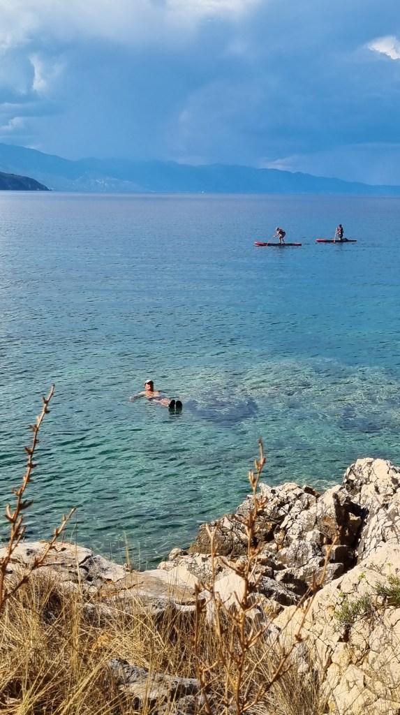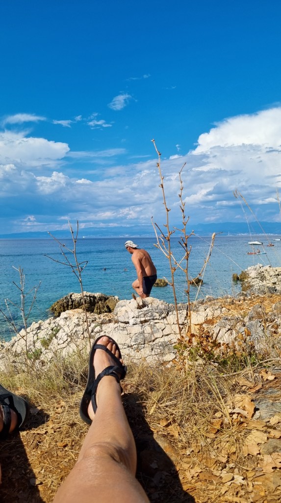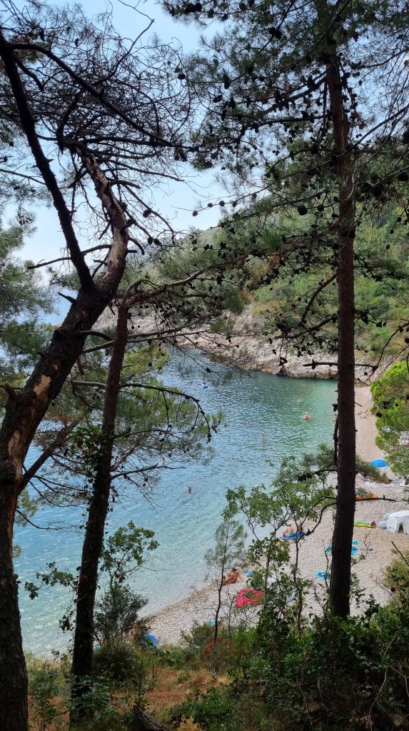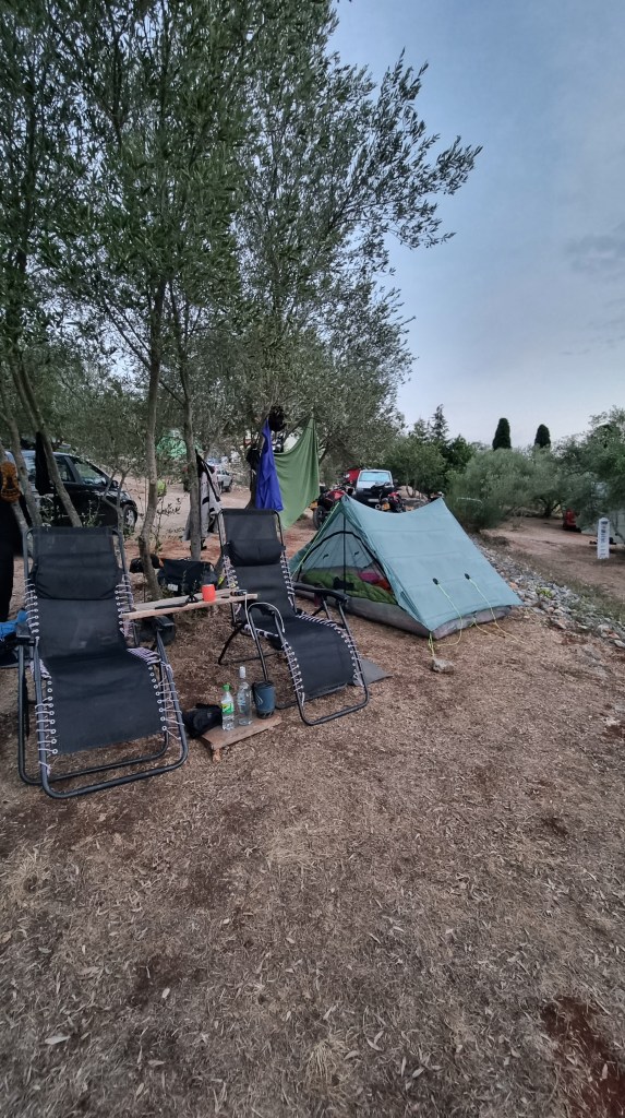 Left one bike there and went 2 up to explore the beaches. 2 days here and we’re sick of dragging pony shit into our tents so Bindi found us another campground further on an island called Krk. We feel like we are in 1st class! Real showers, taps, rubbish bins (we must be getting old) and right on the water.